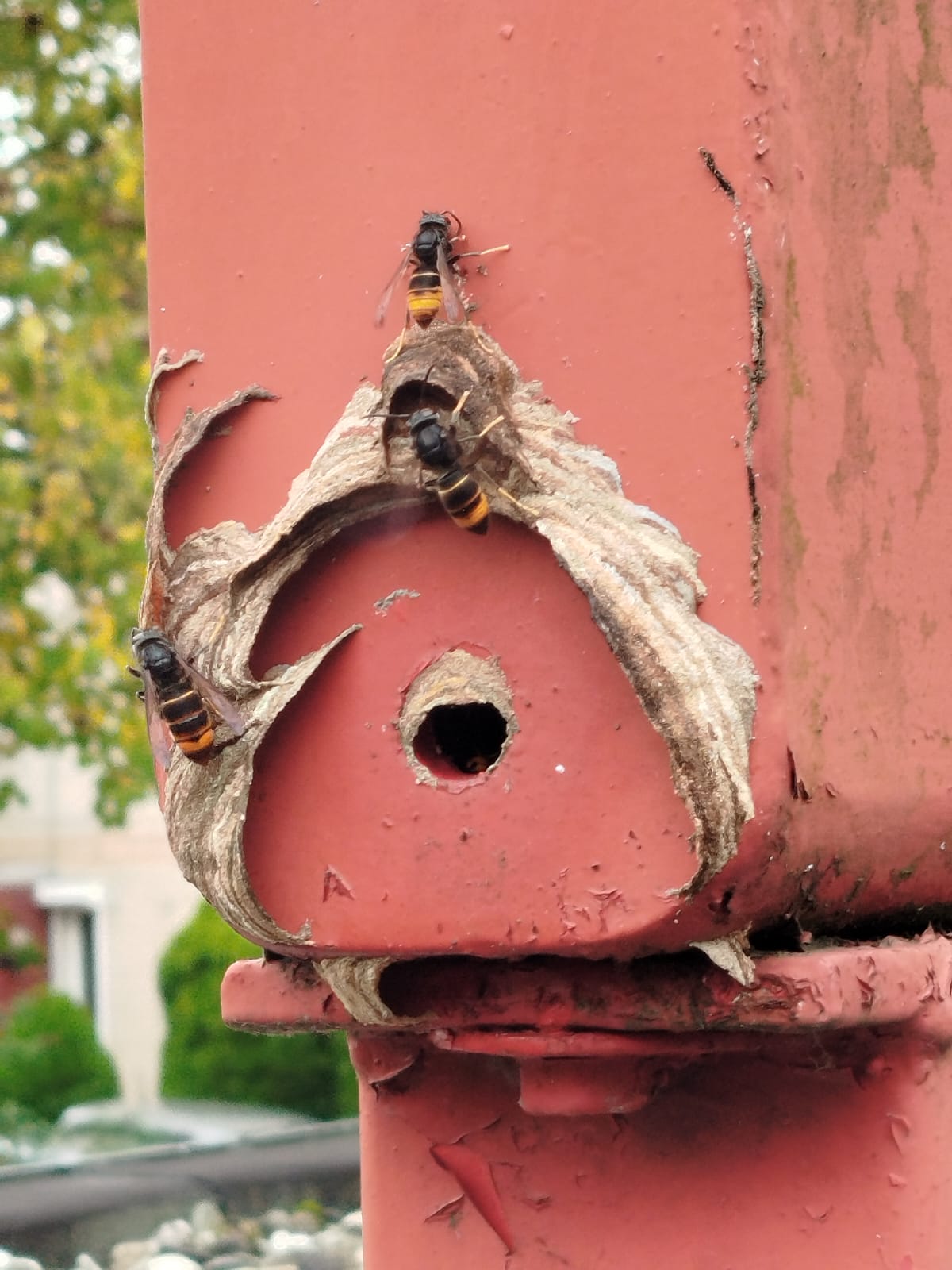 Vanmiddag weer een nestje Aziatische hoornaars in Groot-Ammers. Zijn in tekening duidelijk te onderscheiden van een gewone wesp!