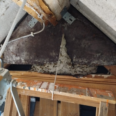 Deze wespen hadden als favoriete plek de hooizolder uitgekozen, helaas voor deze koningin heeft ze het niet tot een goed einde kunnen volbrengen....
