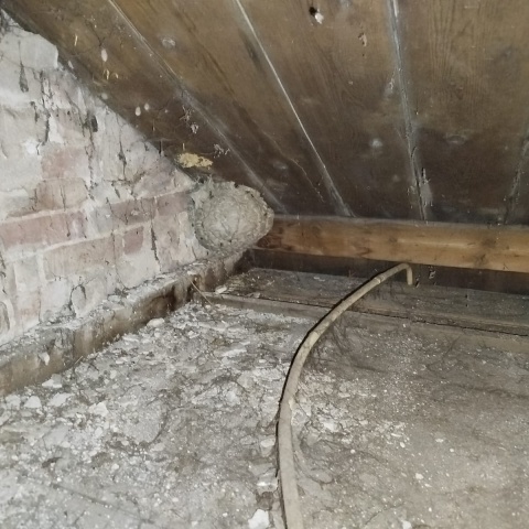 Deze wespen hadden als favoriete plek de hooizolder uitgekozen, helaas voor deze koningin heeft ze het niet tot een goed einde kunnen volbrengen....