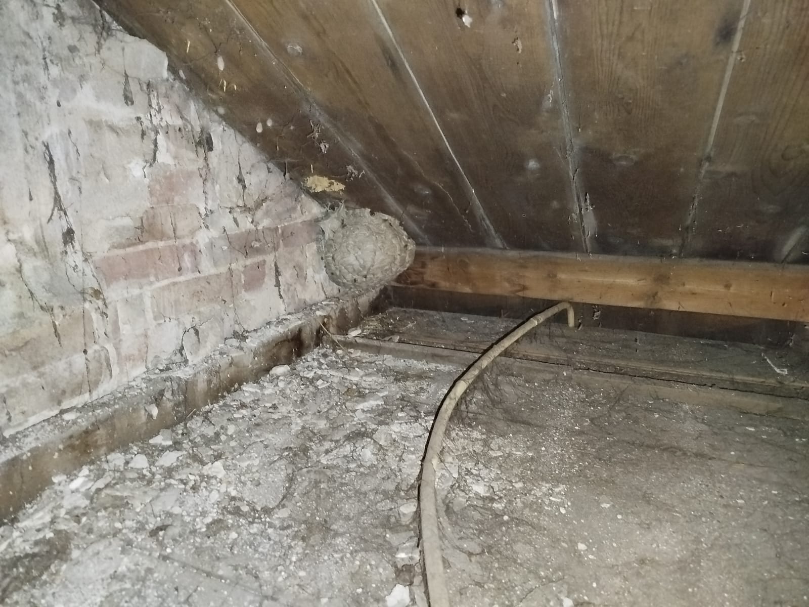 Bewoners zagen ze de spouw in en uit vliegen, bij inspectie nest vindbaar: mooi om een balk heen gedrapeerd.
